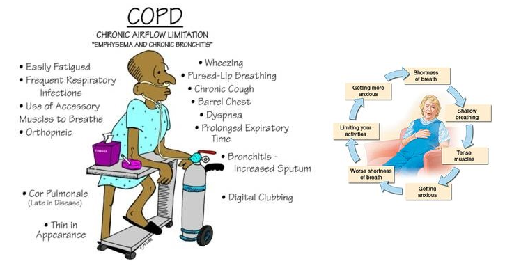 Chronic Obstructive Pulmonary Disease, let's take this term and look at each word. Chronic meaning long term, something that must be managed as it is not resolvable. Obstructive meaning that something is in the way, in this case blocking the airway. Pulmonary refers to the lungs. So this is a disease of the lungs that is long term and not curable where the lungs and airways are blocked. The bronchioles are blocked due to inflammation and mucus. The alveoli (tiny air sacs) are coated with mucus and tar or other substances resulting in the death of the alveoli. Emphysema is another term used for COPD. The #1 cause is smoking but can also be caused from breathing in silica or other harmful particles. Notice the symptoms- shortness of breath, tiredness, edema (swelling), dyspnea (difficulty breathing). These residents will need frequent rest periods between activity, such as pausing to rest for a few minutes when walking to the dining room.