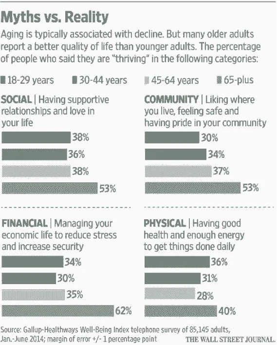 According to numerous studies in geriatrics (branch of medicine dealing with the health and care of the eldery), perceiving aging in terms of just disability or decline leads to poorer physical health outcomes. Becca Levy, associate professor at Yale School of Public Health, quoted in the Wall Street Journal article above, went as far as describing negative stereotypes about aging as "a public health issue".